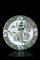 Piatto in porcellana Famiglia Verde, decorato con scena di palazzo, la tesa con decoro floreale e riserve con uccellini