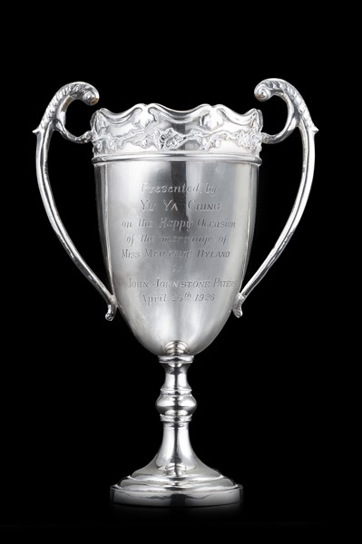 A two-handled goblet in finely chiselled silver, with wedding inscription