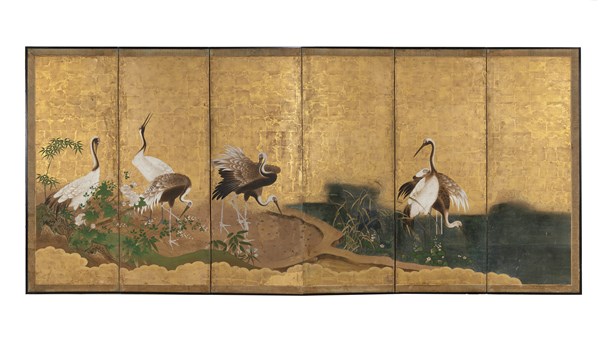 Paravento a sei ante decorato con gru su fondo oro e vegetazione (difetti)
