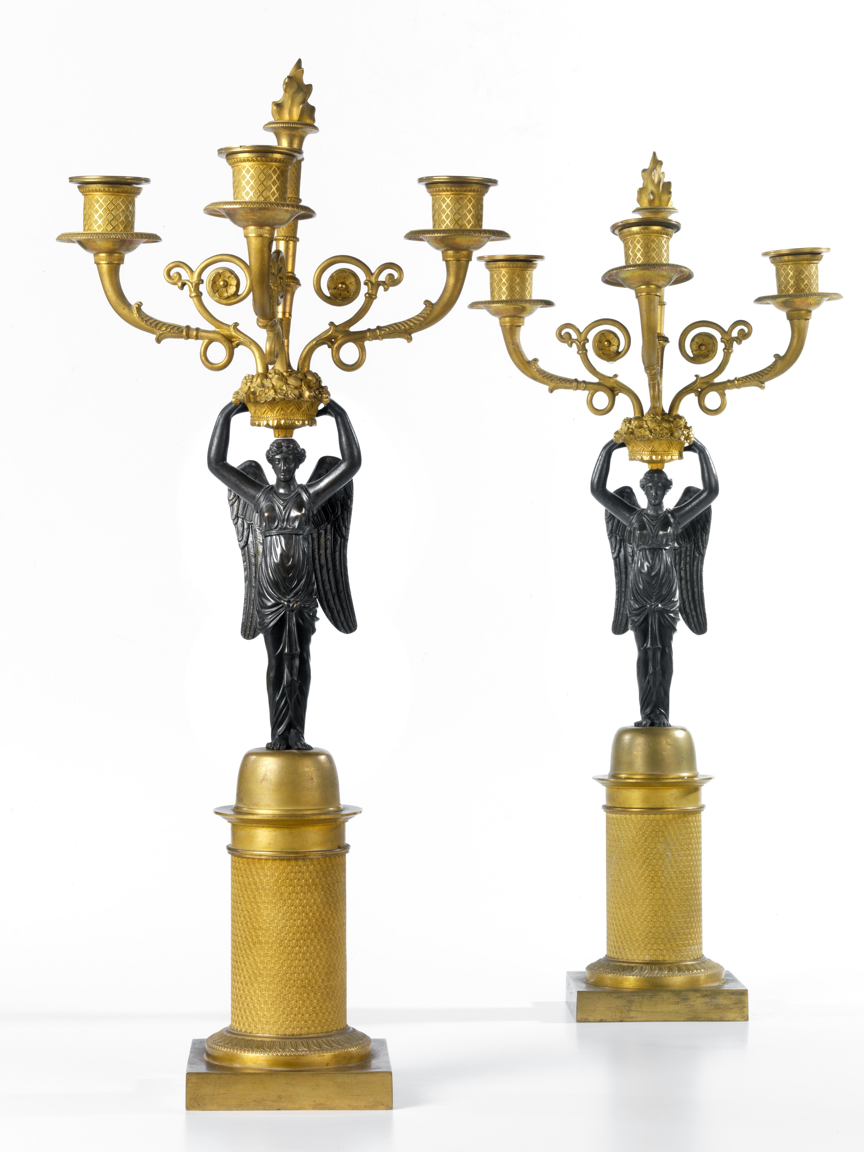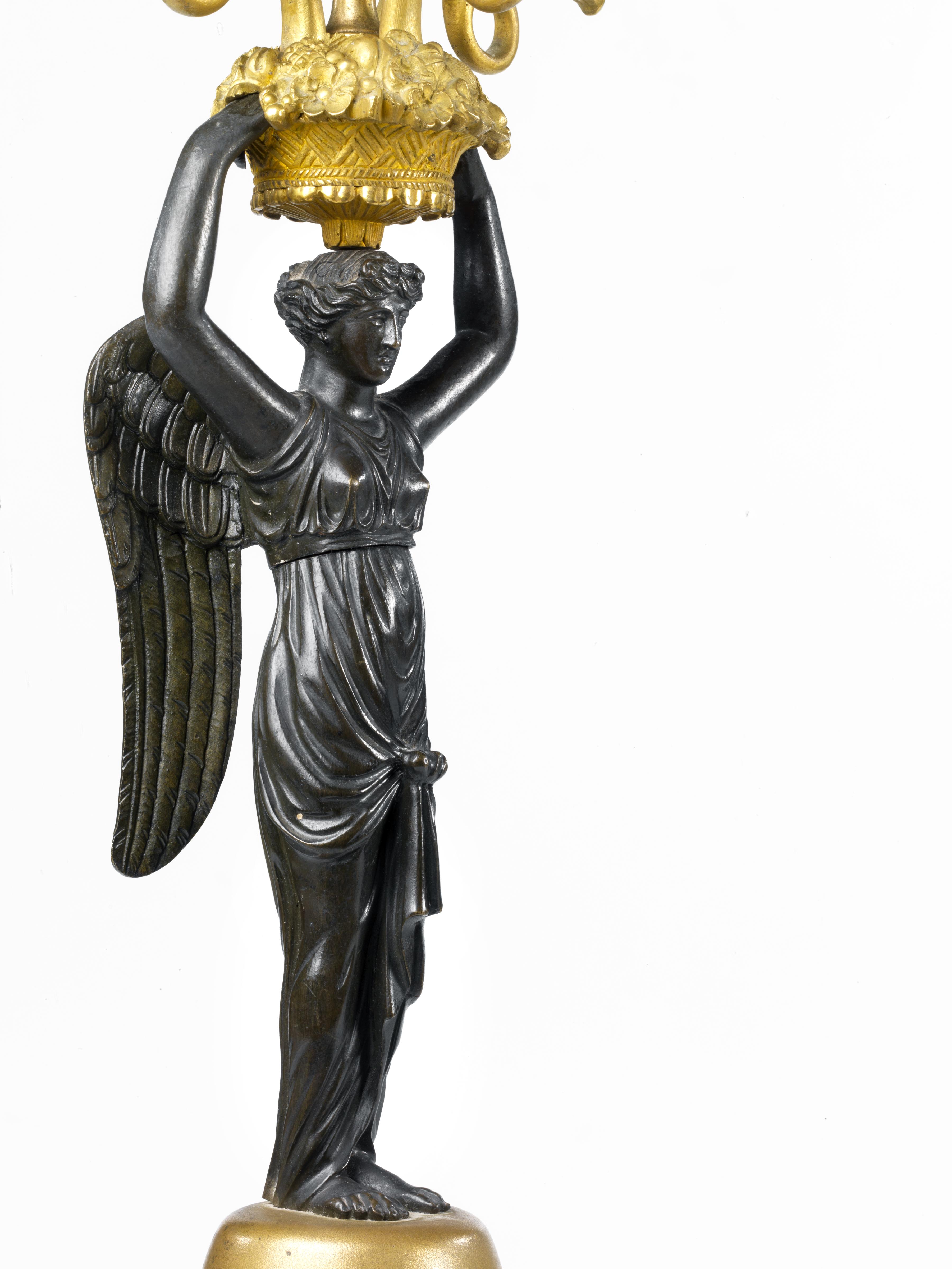 Coppia di candelabri, periodo Impero, sec. XIX, in bronzo patinato e dorato, fusti a figure femminili alate che sorreggono sulla testa una cesta di fiori e frutti dal quale si dipartono tre bracci portacandele a forma di cornucopia poggianti su semicolonna cesellata a fitto motivo geometrico su base quadrata, alt. cm 53 (2)