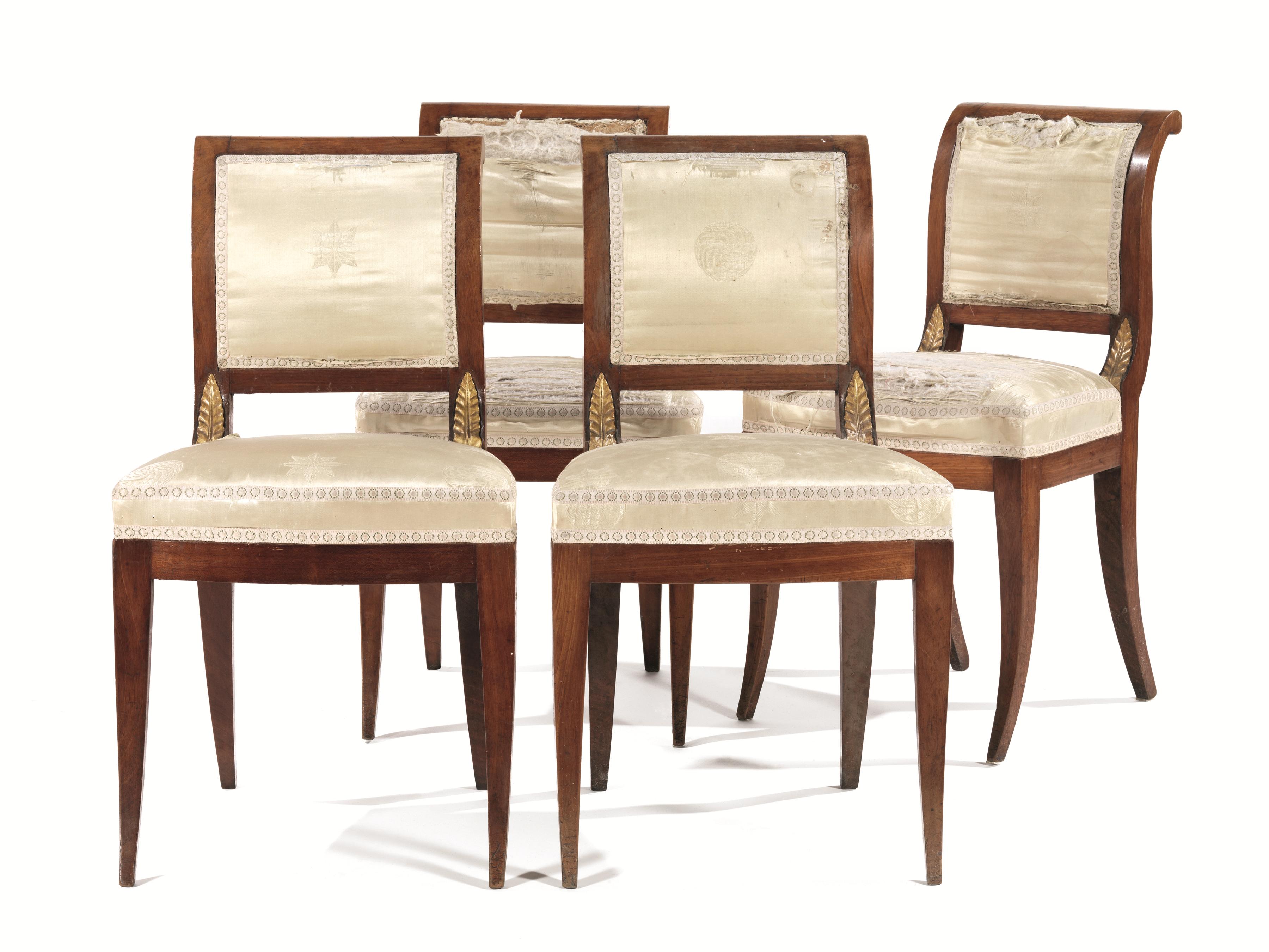 Quattro sedie, Toscana, prima metà sec. XIX, in noce a patina bionda, spalliera con cartella desinente a ricciolo, gambe a sciabola, ricoperte in seta avorio, lievi danni (4)
