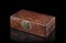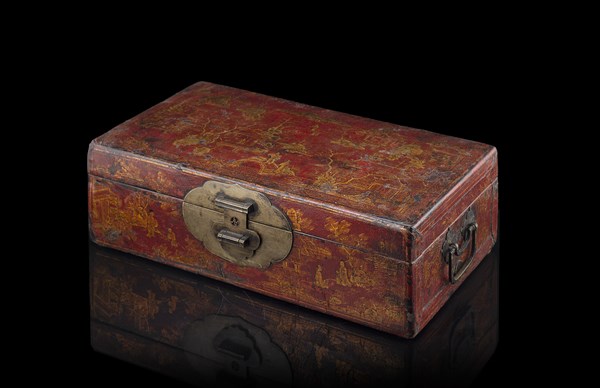 A rectangular leather and wood box, painted in red and gilted (defects)