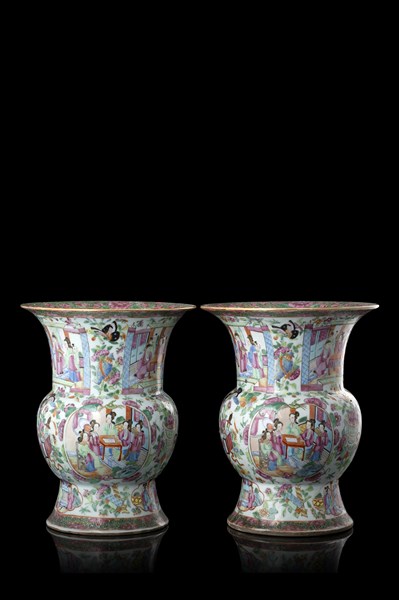 Coppia di vasi in porcellana Canton, decoro Famiglia Rosa, decorati con figure e oggetti (lievi difetti)