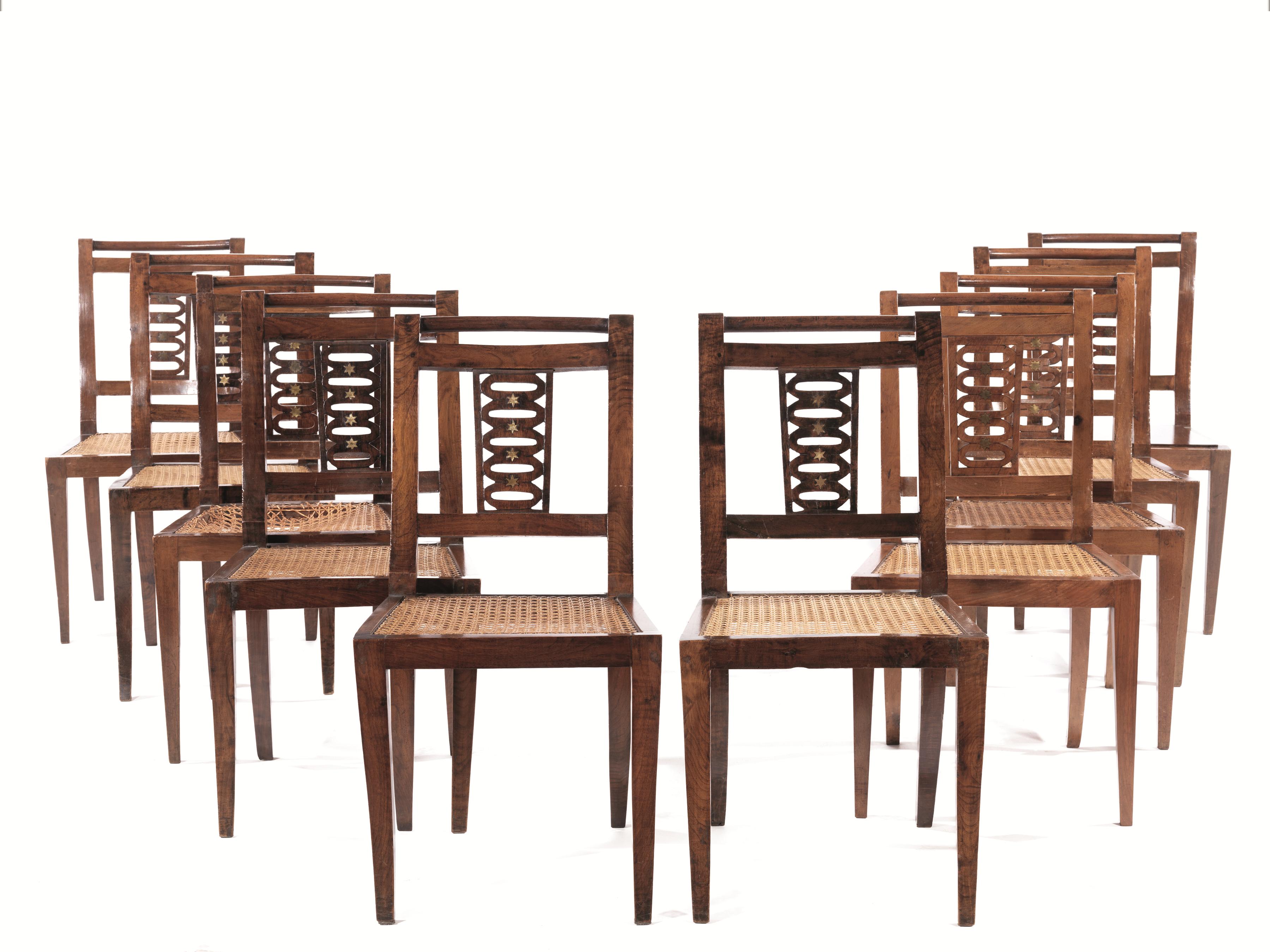 Dieci sedie, Lombardia, metà sec. XIX, in noce intagliato, spalliera con cartella traforata e decorata da stelle in bronzo, sedili in cannettè, gambe a sciabola, complete di cuscini in seta verde, un sedile in noce, alcuni danni (10)