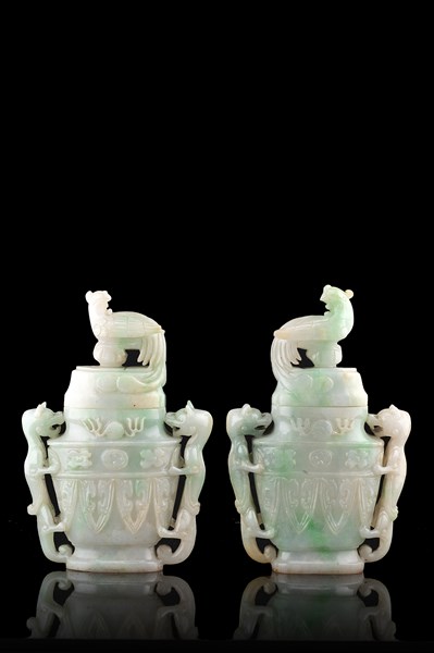 Coppia di piccoli vasi con coperchio in giadeite bianca e verde mela, decorati a rilievo con simboli arcaici, anse a forma di qilin, coperchi sormontati da fenici. Cina, fine dinastia Qing, fine secolo XIX