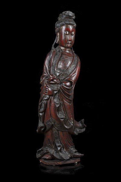 Grande Guanyin in legno intagliato e laccato rosso, applicazioni in passiglia d