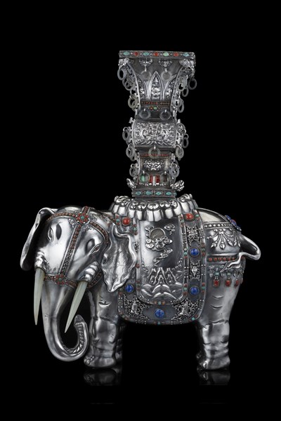 Elefante in argento sbalzato reggente un vaso di forma arcaica, applicazioni in pietre dure, paste vitree e giade (difetti)