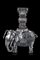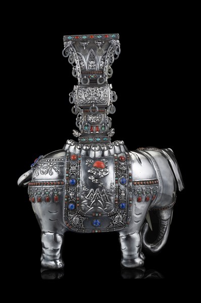 Elefante in argento sbalzato reggente un vaso di forma arcaica, applicazioni in