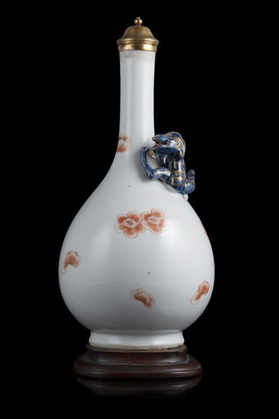 Vaso a bottiglia in porcellana bianca a decoro floreale e con drago blu a tutto tondo in rilievo, montato in metallo dorato, base in legno (incollato alla base) (restauri)