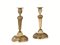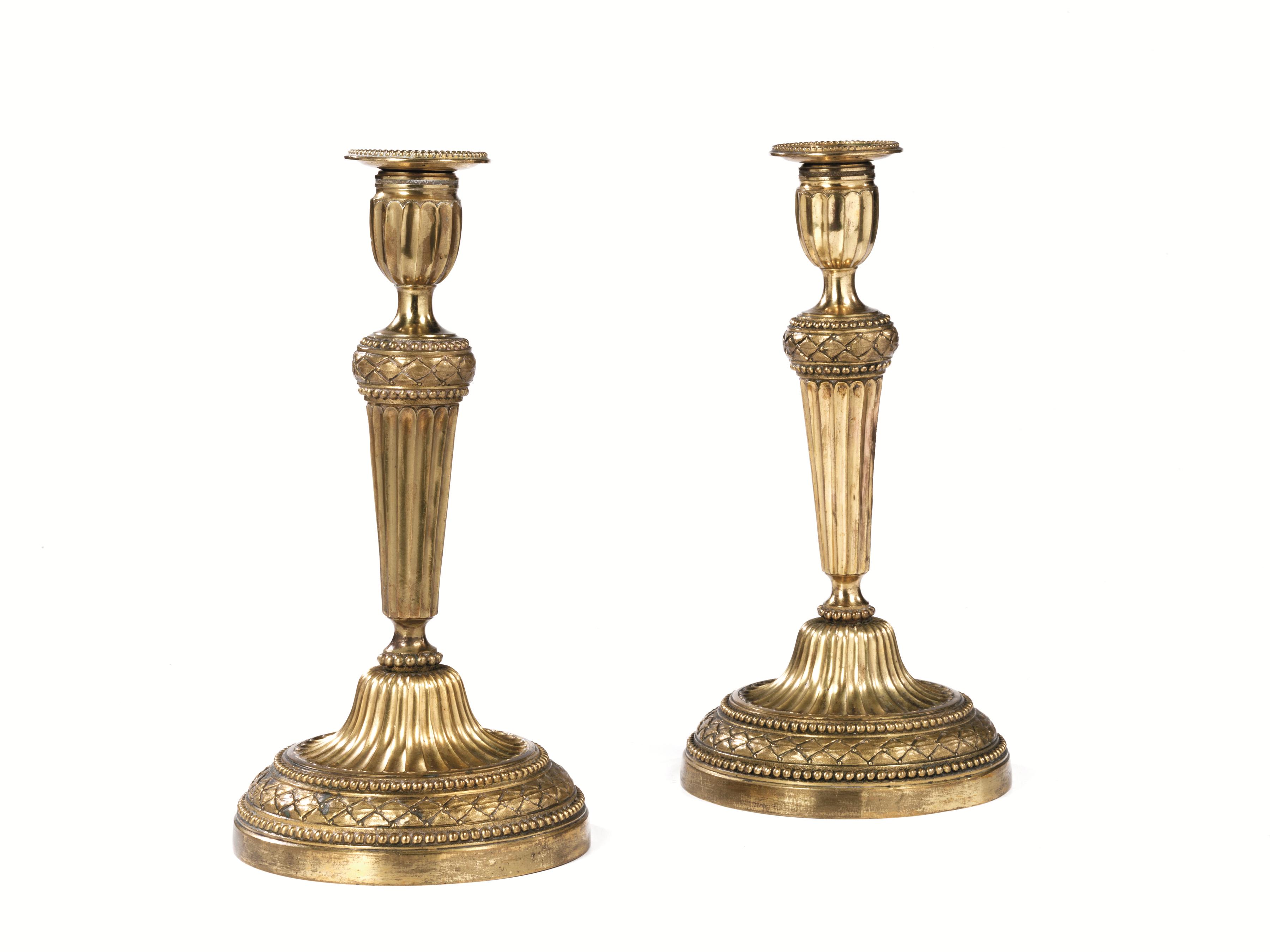 Coppia di candelieri, sec. XIX, in bronzo dorato, fusto a colonna rastremata, base circolare con bordi perlinati e decorata da motivi romboidali, alt. cm 29,5 (2)
