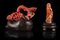 Two pink and red coral carvings, on wood and brown lacquered bases