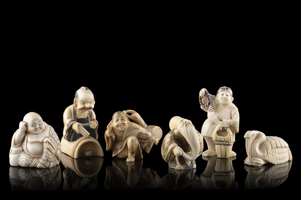 Lotto composto da sei netsuke in avorio di cui una raffigurante un pellicano