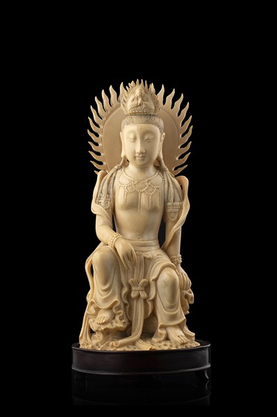 Scultura in avorio raffigurante Guanyin coronata e con aura di luce, base in le