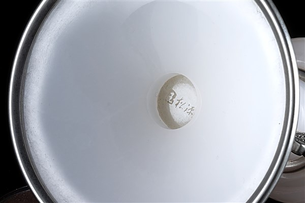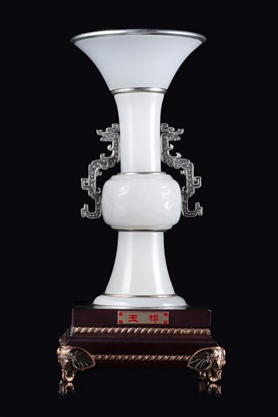 Vaso di forma arcaica "Gu", in giada bianca montato in metallo argentato, base