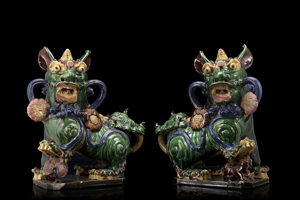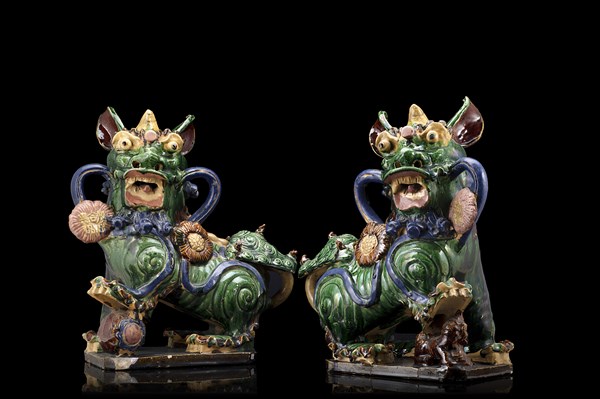 Coppia di leoni buddhisti in ceramica policroma (difetti) Cina, fine secolo XIX