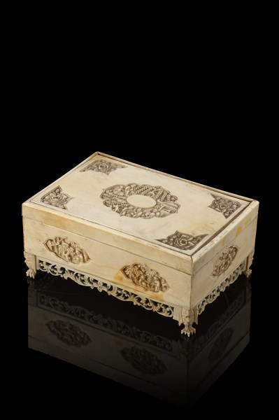 A small ivory box, carved with figures (defects and breakage)