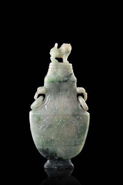 Vaso di forma arcaica con coperchio in giadeite verde, anse con anelli