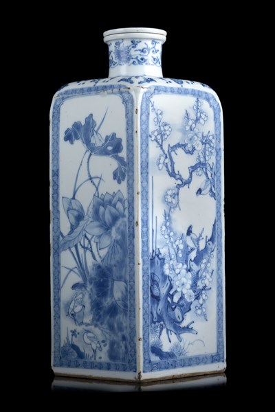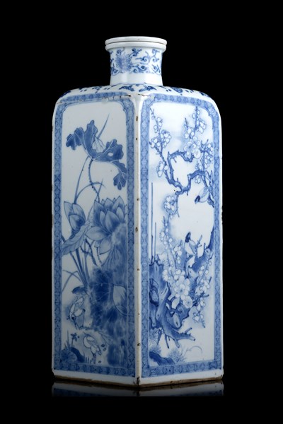 Bottiglia in porcellana bianca e blu, decorata a riserve con motivi floreali e uccellini, il collo a ramages e simboli buddhisti, completa di tappo (lievi difetti)