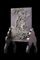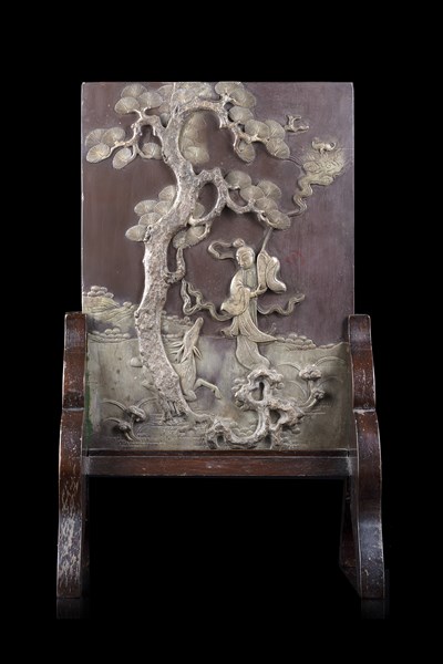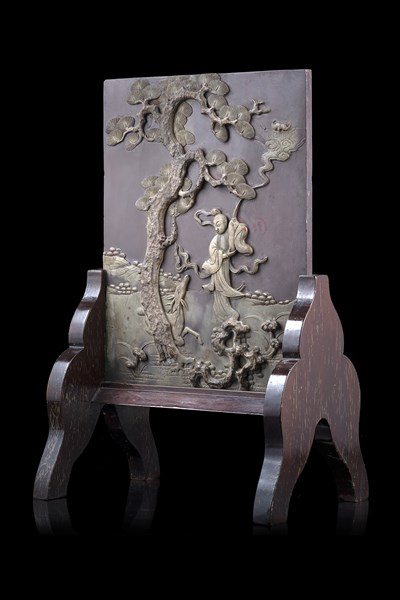 Schermo da tavolo in pietra saponaria, decorato in rilievo con figura in paesaggio con arbusti, base in legno