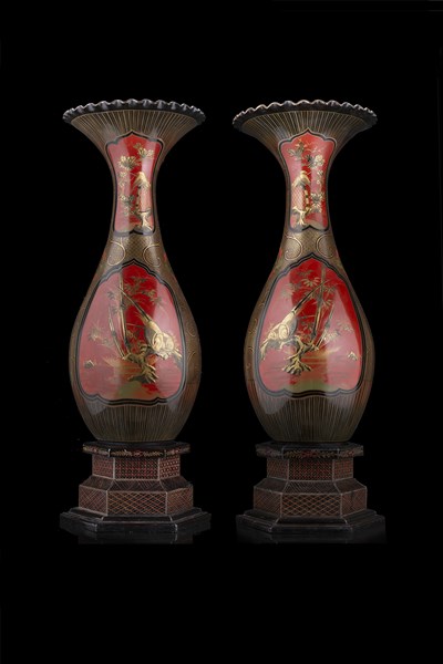 Coppia di grandi vasi in porcellana laccata decorati a riserve con gru e arbust