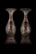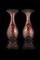 A pair of lacquered porcelain vases, decorated with cranes and shrubs, on a geometric pattern ground, with hexagonal wood bases (restorations)
