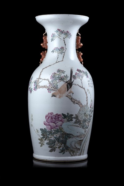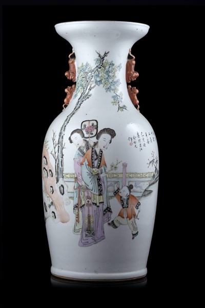Vaso in porcellana bianca decorato in policromia con figure femminili ed un bambino. Cina, dinastia Qing, periodo Guangxu, fine secolo XIX