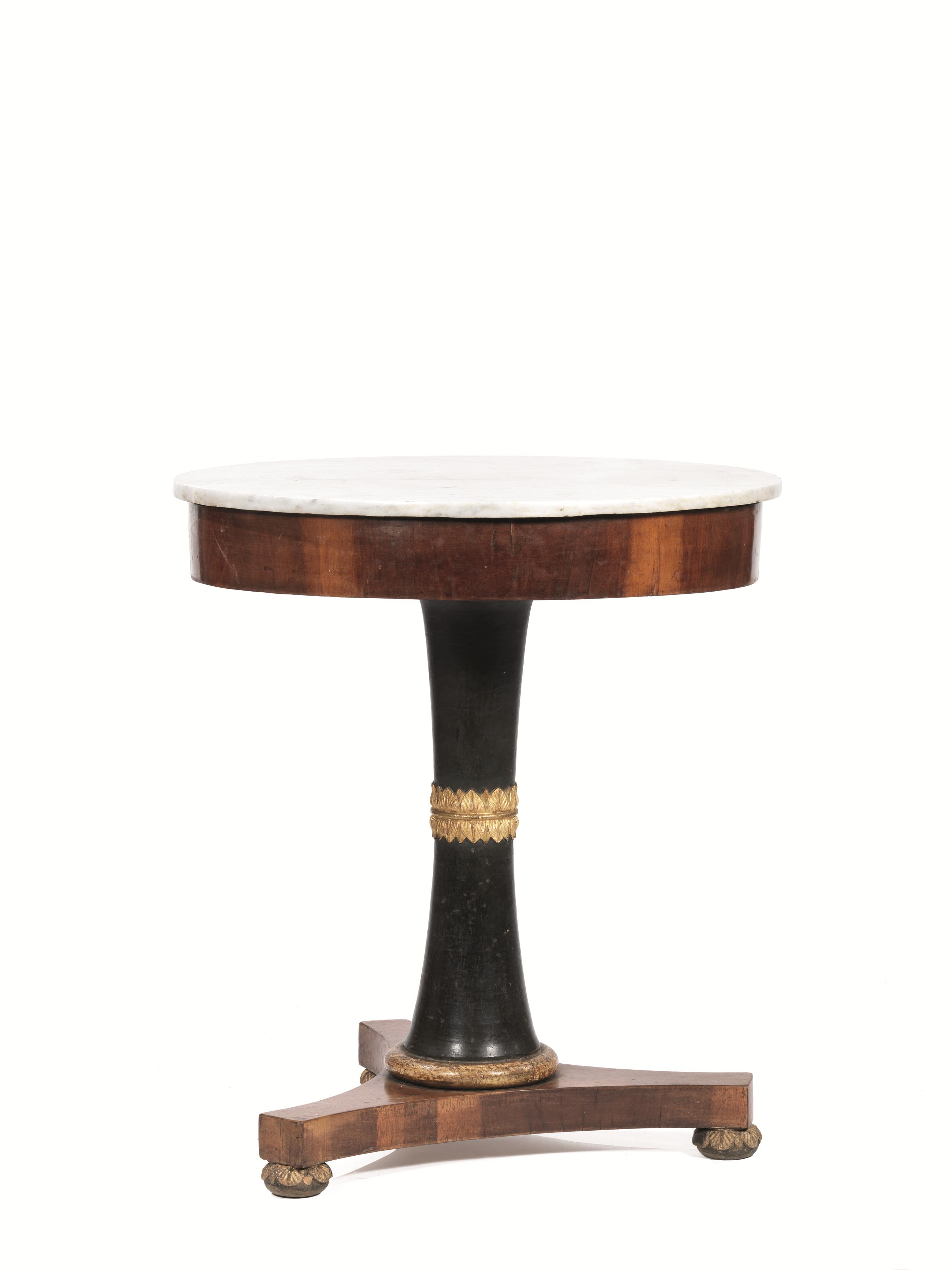 Tavolino da centro, Toscana, inizi sec. XIX, in noce, piano circolare in marmo bianco, fusto a balaustro ebenizzato con collarino di foglie d'acanto dorate, base tripode su piedi a cipolla, diam. cm 73, alt. cm 82