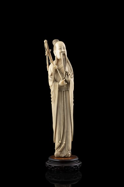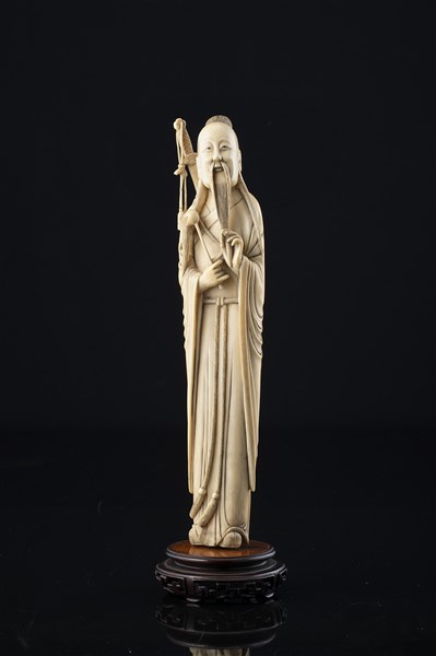 Scultura in avorio raffigurante dignitario, base in legno, in custodia