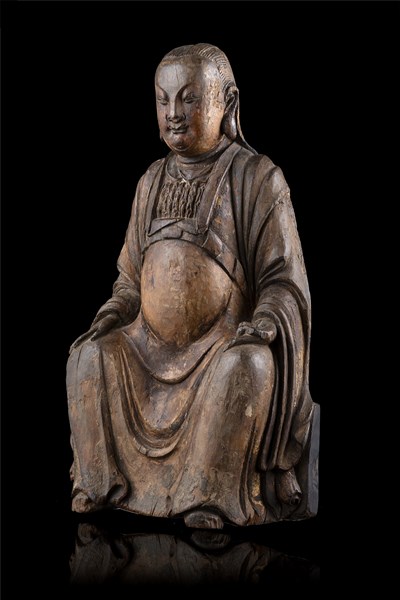 A carved wood dignitary sculpture, traces of gilding and pigment. China, Qing dynasty, late 17th c. (slight defects)