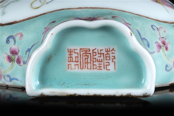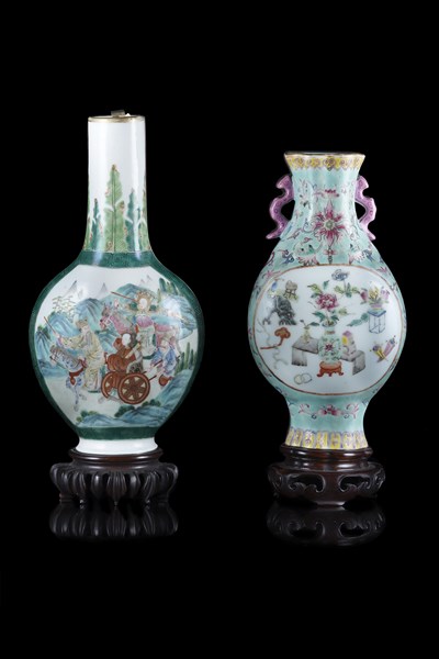 Due vasi da muro in porcellana Famiglia Rosa, uno a fondo verde e con riserva decorata con oggetti, anse rosa, marchio Qianlong (h. 22,5 cm.), e l'altro decorato con figure in paesaggio montano (h. 25,4 cm.), con supporti in legno