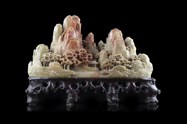 A large soapstone group of a mountain landscape with pagodas and trees (defects). China, late Qing dynasty (1644-1911)