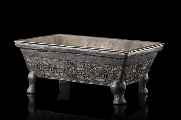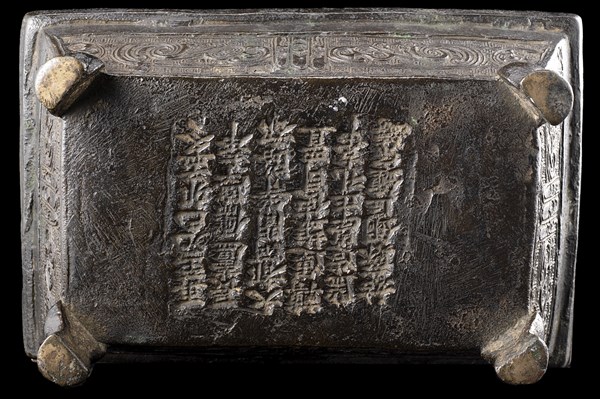 A rectangular censer, decorated with archaic geometric motifs, removable metal coating, long inscription under the base. China, late Ming dynasty, 17th c.