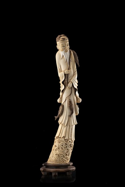 Figura di pescatore in avorio, su base lignea Manifattura orientale, secolo XIX