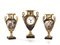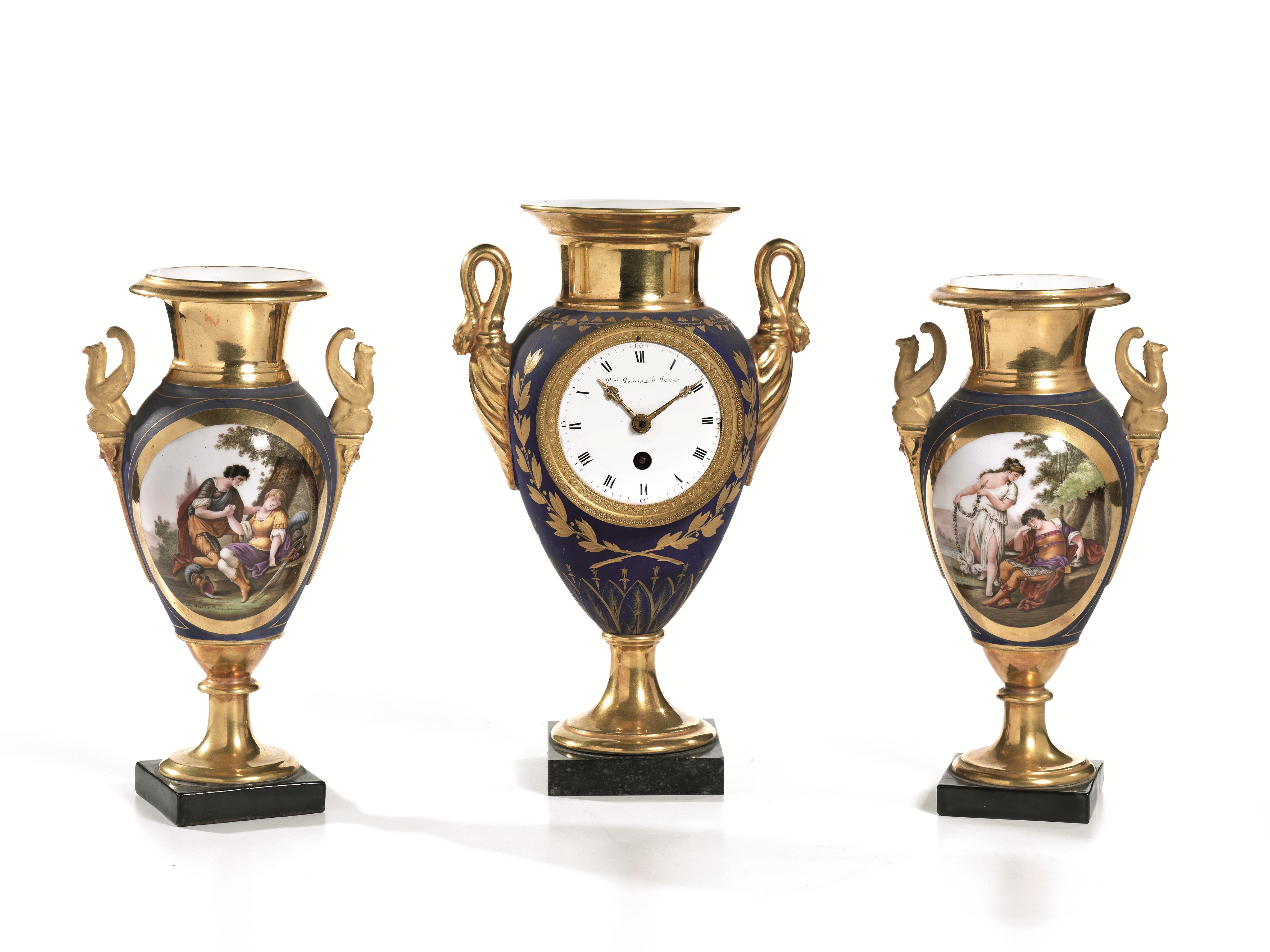 Trittico da camino, Parigi, inizi sec. XIX, composto di orologio con quadrante in smalto firmato Bmi Perrin à Paris, montato in vaso in porcellana blu-oro, anse a collo di cigno affiancato da coppia di vasi in porcellana blu-oro, decorati a medaglioni con figure mitologiche, anse a grifoni, alt. cm 27,8 e cm 25, un vasetto con collo restaurato e anse dell'orologio e anse dell'orologio danneggiate, meccanismo dell'orologio da revisionare (3)