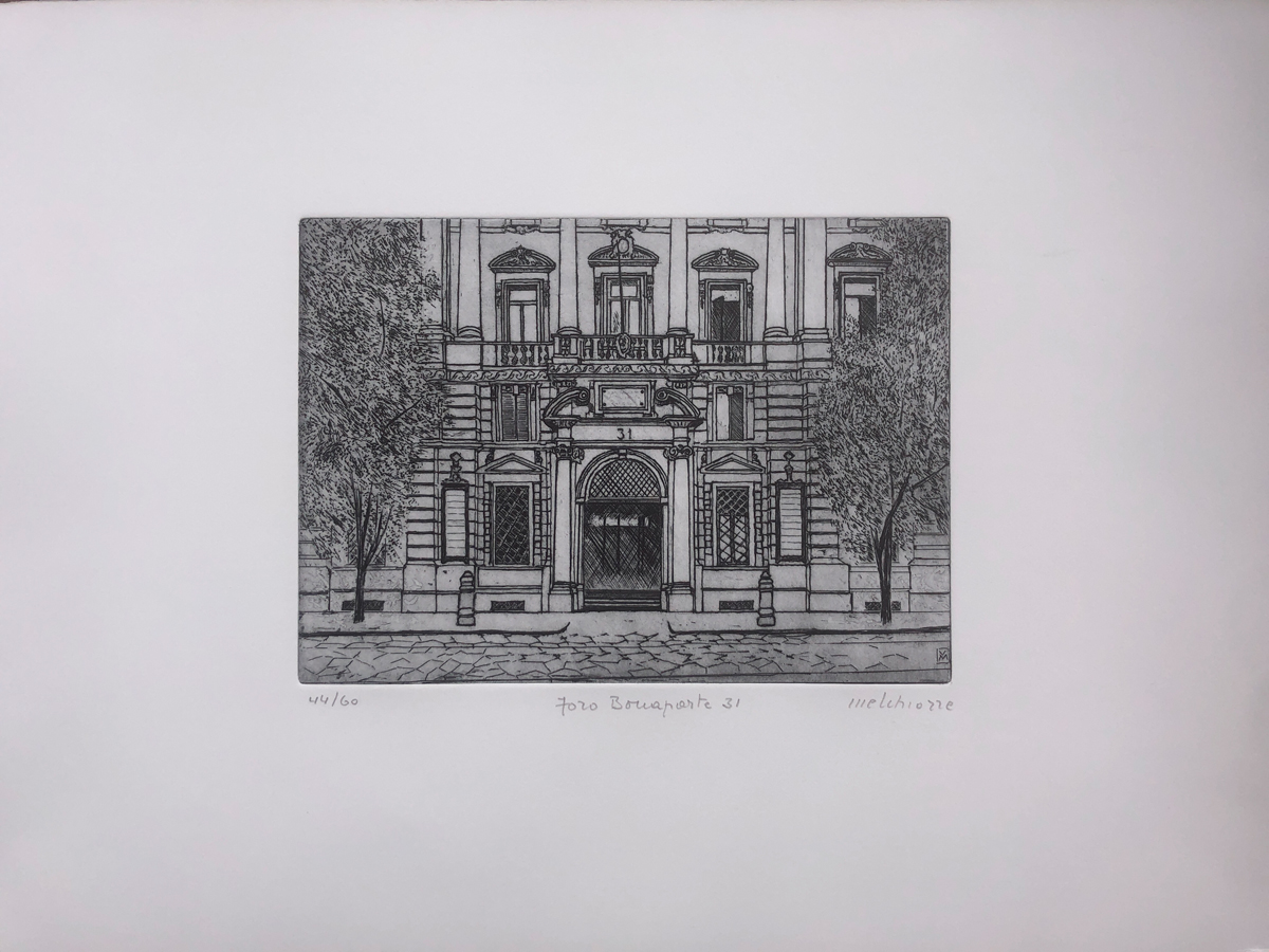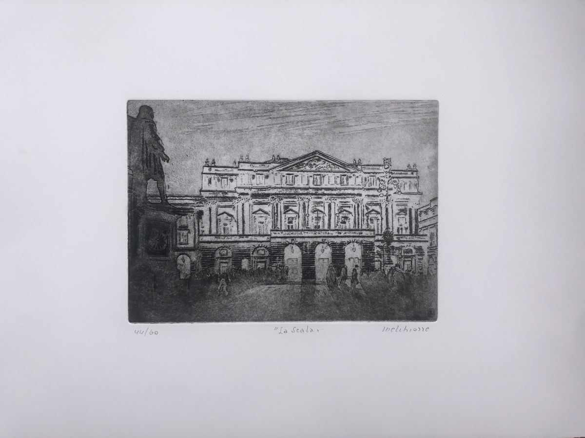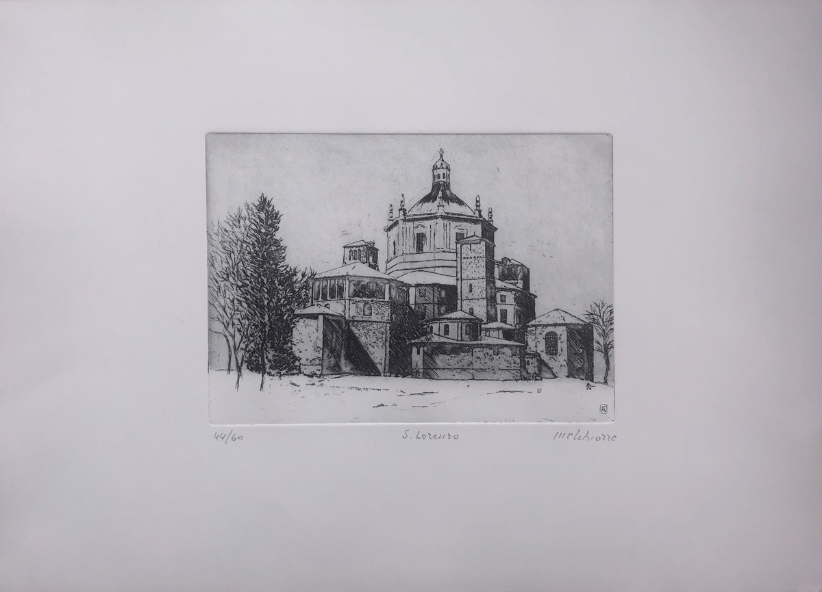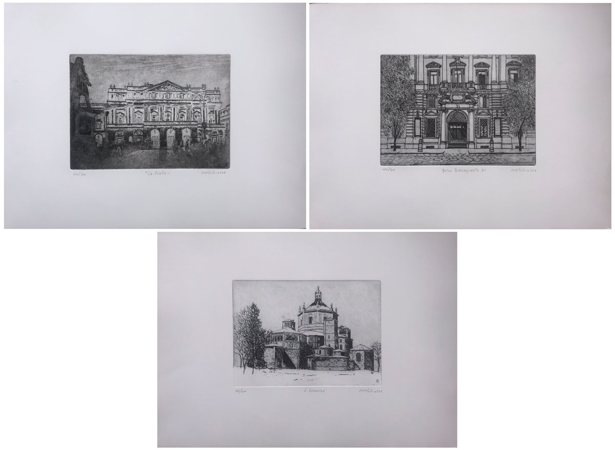 Lotto unico di 3 acqueforti su carta Magnani Pescia, ciascuna recante firma, titolo (La Scala, Foro Bonaparte 31 e S. Lorenzo) e numerazione (Esemplari 44/60) a matita al fronte