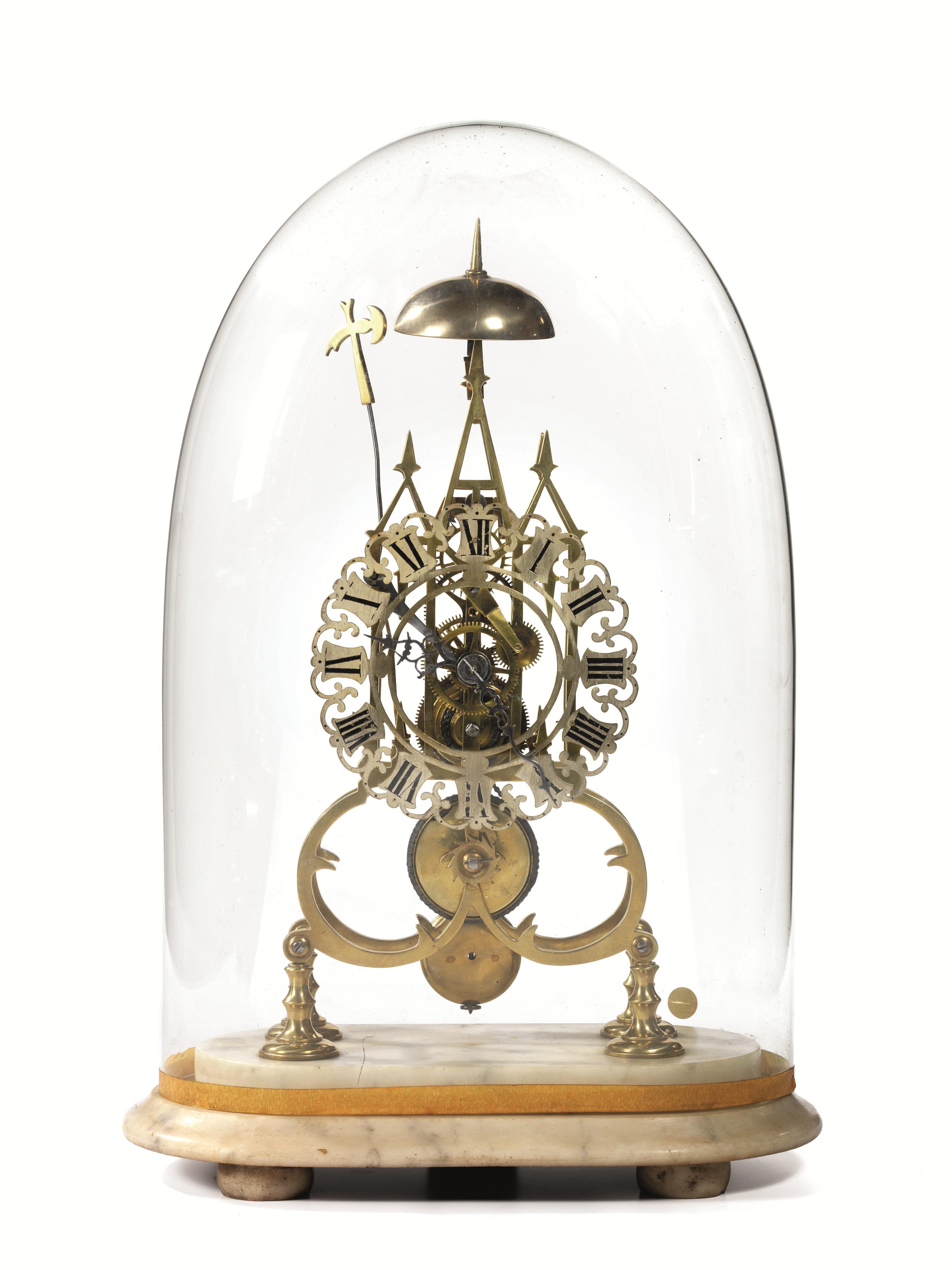 Orologio squelette, Francia seconda metà sec. XIX, in ottone, base ovale gradinata in marmo, meccanismo con scappamento ad ancora, sospensione d'acciaio, suoneria a passaggio, suona le ore, carica otto giorni con trasmissione succonoide, alt. cm 47, completo di campana, meccanismo da revisionare