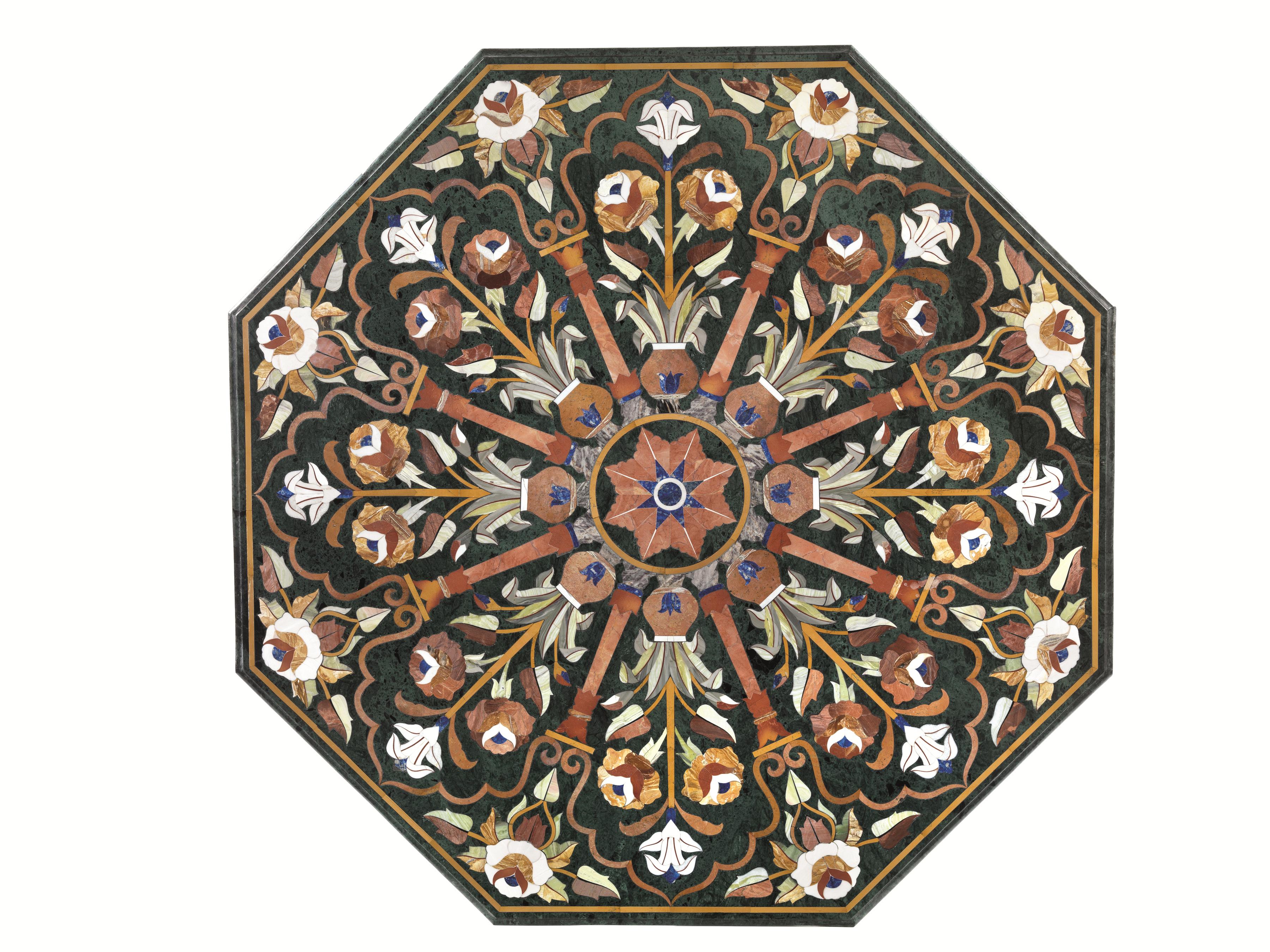 Lot 196 | Tavolo, sec. XX, piano ottagonale in marmo verde intarsiato a motivi floreali...