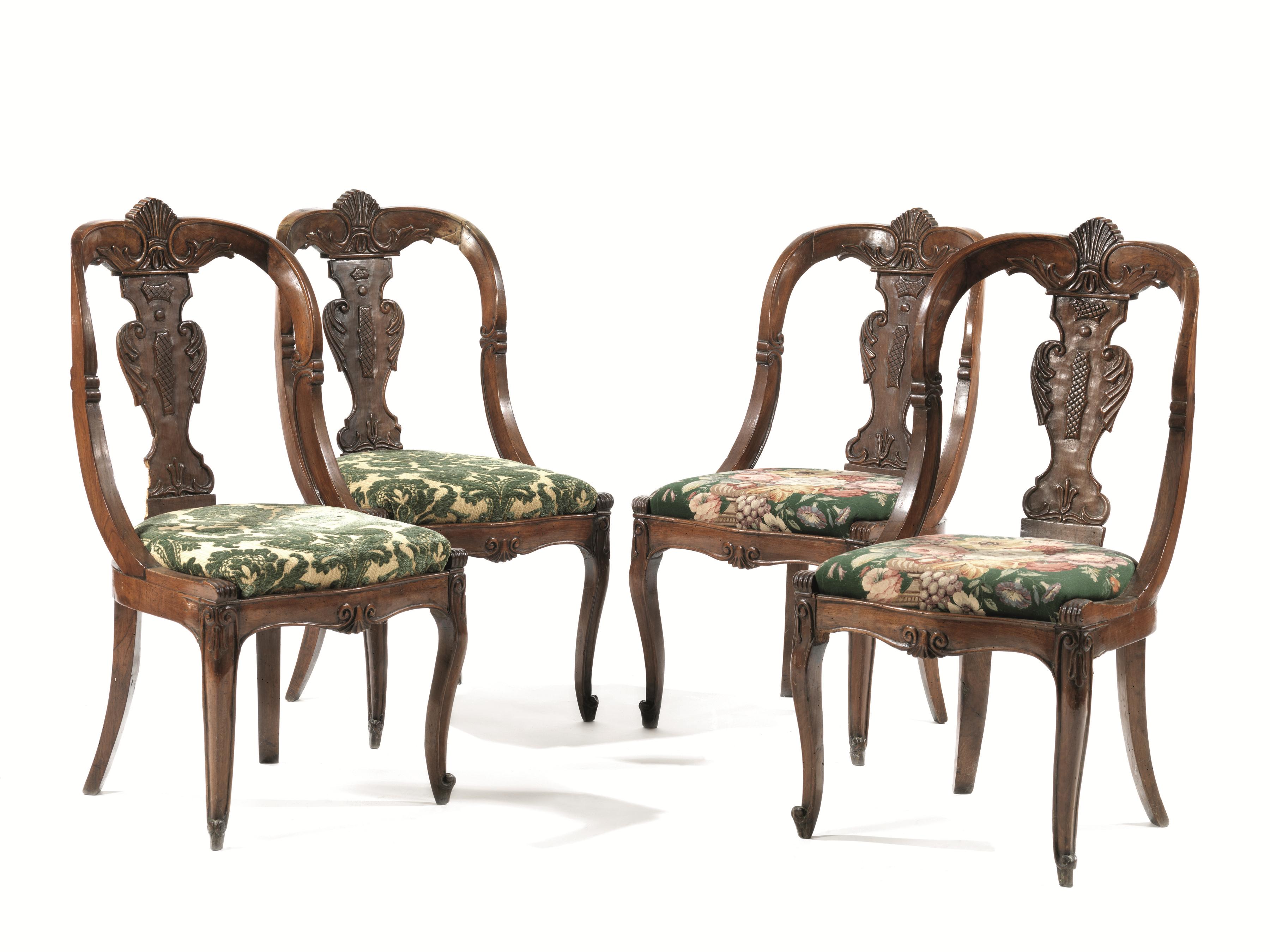 Quattro sedie, Genova, 1850 circa, in noce intagliato, spalliera a gondola...