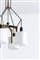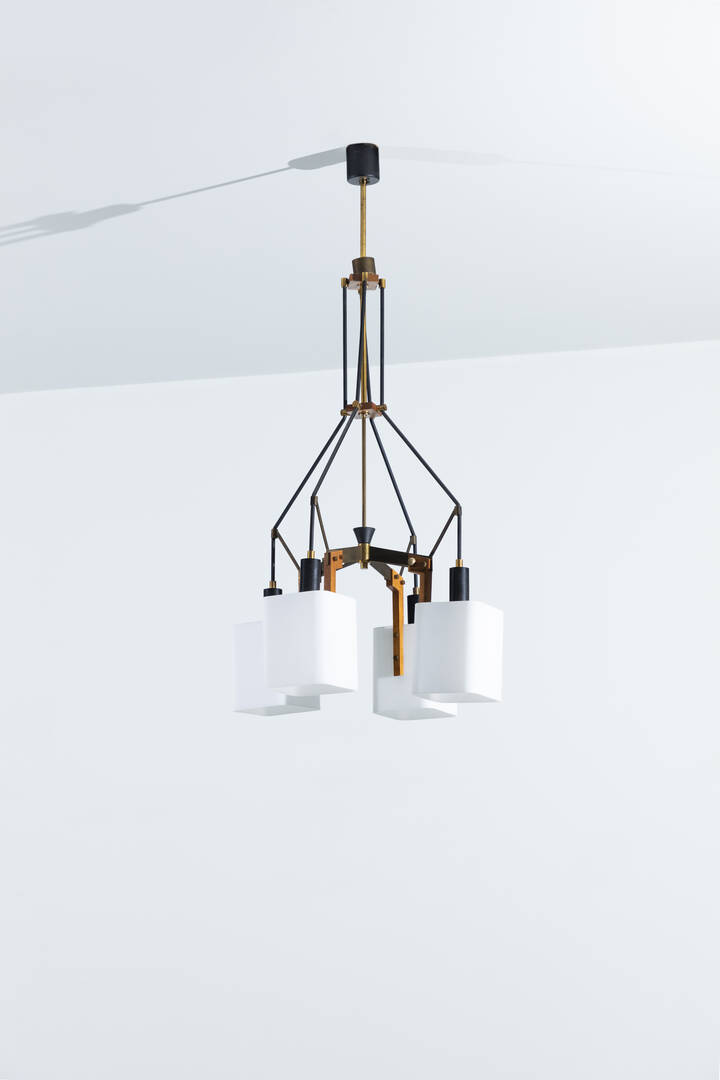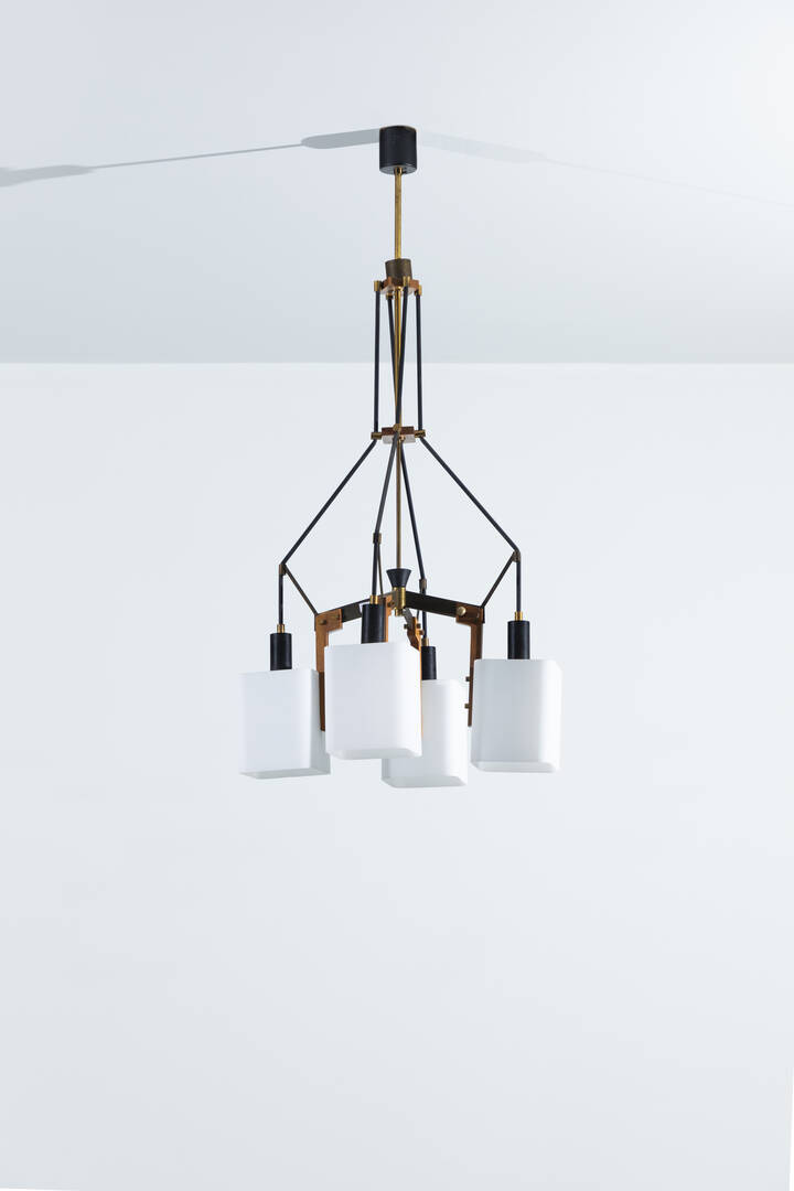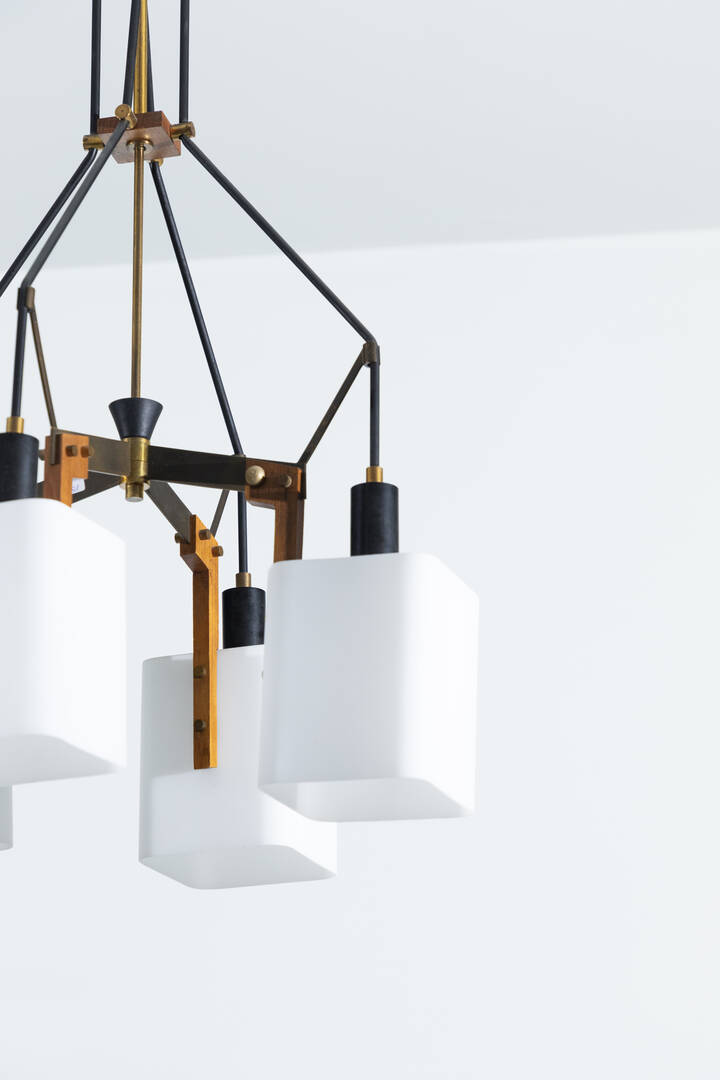 Lampadario in metallo verniciato, legno, ottone e diffusori in vetro satinato.