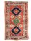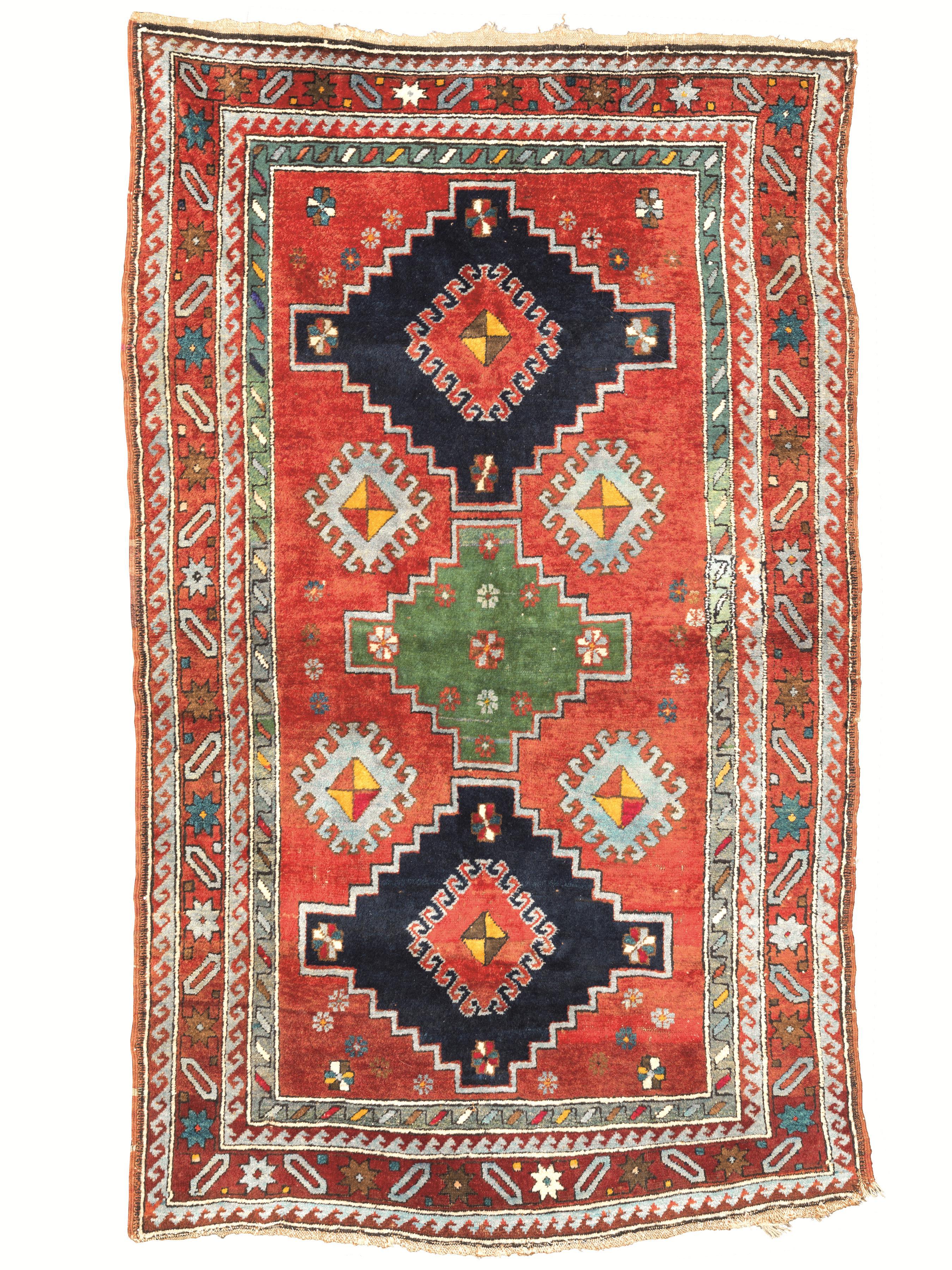 Tappeto caucasico Kazak, inizi sec. XX, fondo rosso mattone con tre medaglioni nei toni del blu e del verde, bordura uncinata nei toni dell'azzurro e del verde, cm 200x120