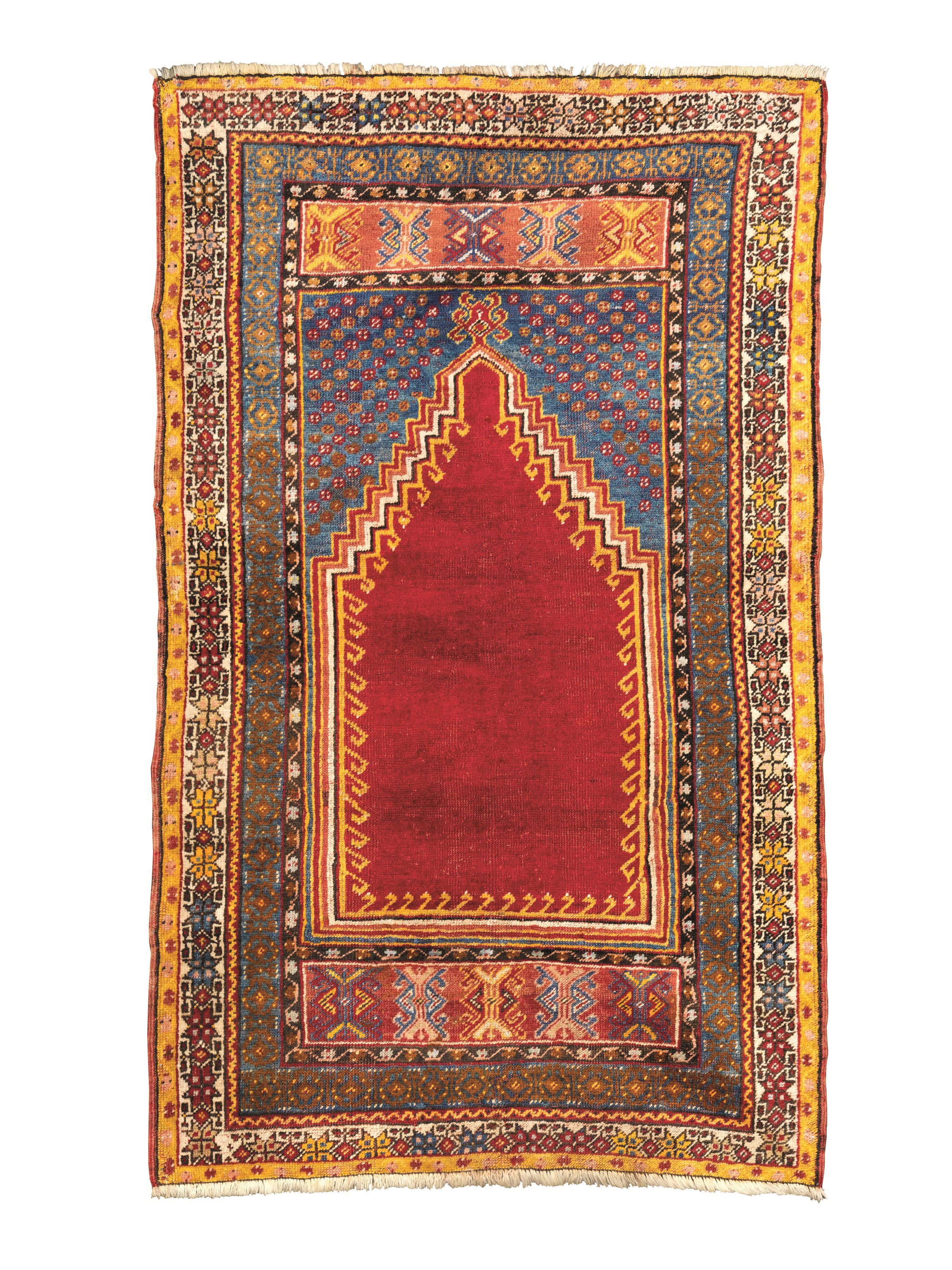 Preghiera anatolica Konya, inizi sec. XX, fondo azzurro con nicchia rossa, nel campo decori stilizzati nei toni del giallo e del rosa, brodura bianca con stelle gialle e azzurre, cm 163x100