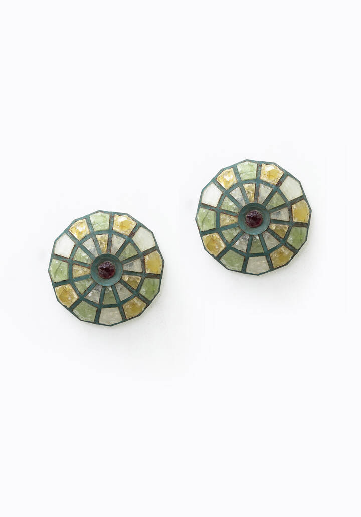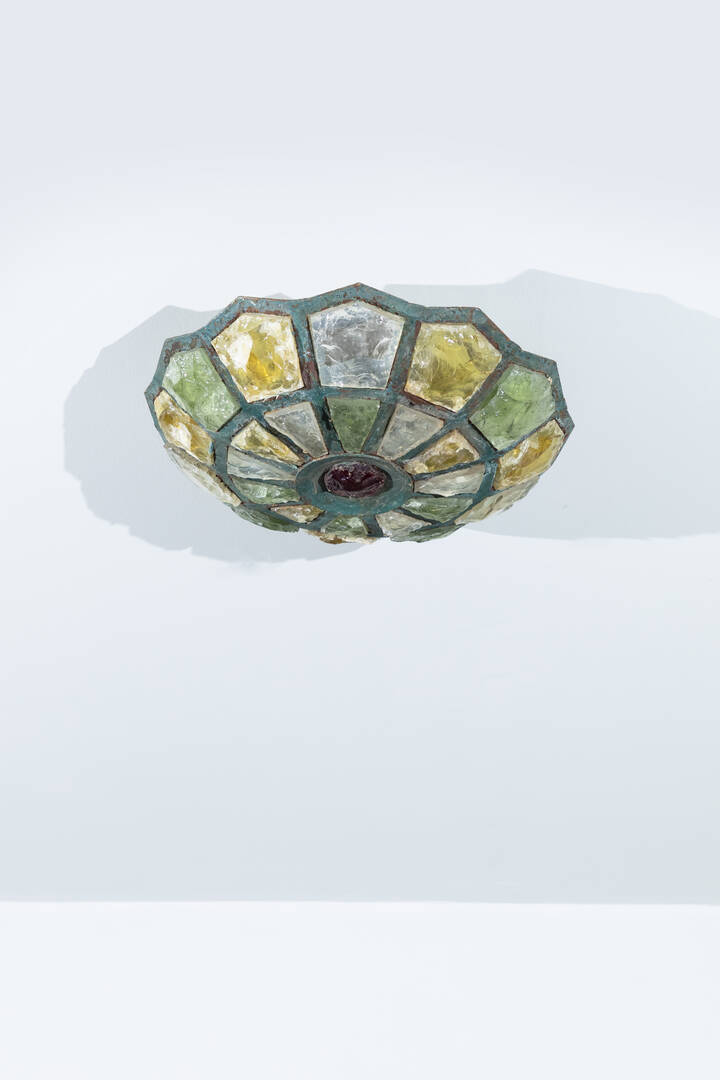 Coppia di lampade a plafone con struttura in ferro ed inserti in vetro di Murano policromo.