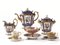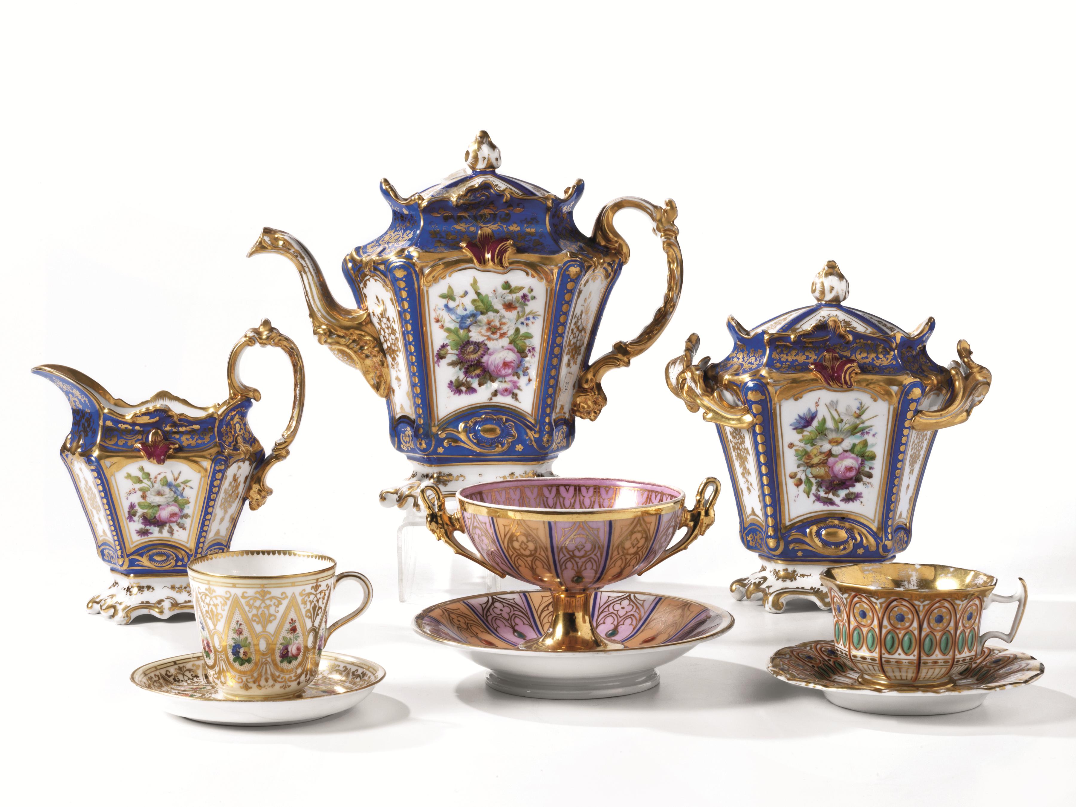 Coppia di antipastiere, Francia, fine sec. XIX, in porcellana bianco-oro, ciascuna a tre alloggi decorati da fiori e frutti in policromia, presa a voluta, cm 31x31; servito da tè, Francia, fine sec. XIX, in porcellana bianco-oro dipinta in blu e decorata da riserve con fiori in policromia, composto di teiera, lattiera e zuccheriera e tre tazzine con piattino, Francia, fine sec. XIX, in porcellana bianco oro rispettivamente decorata da fiori policromi, elementi ovoidali in verde e fiori stilizzati e finte pietre preziose su fondo rosa, un piattino restaurato (8)