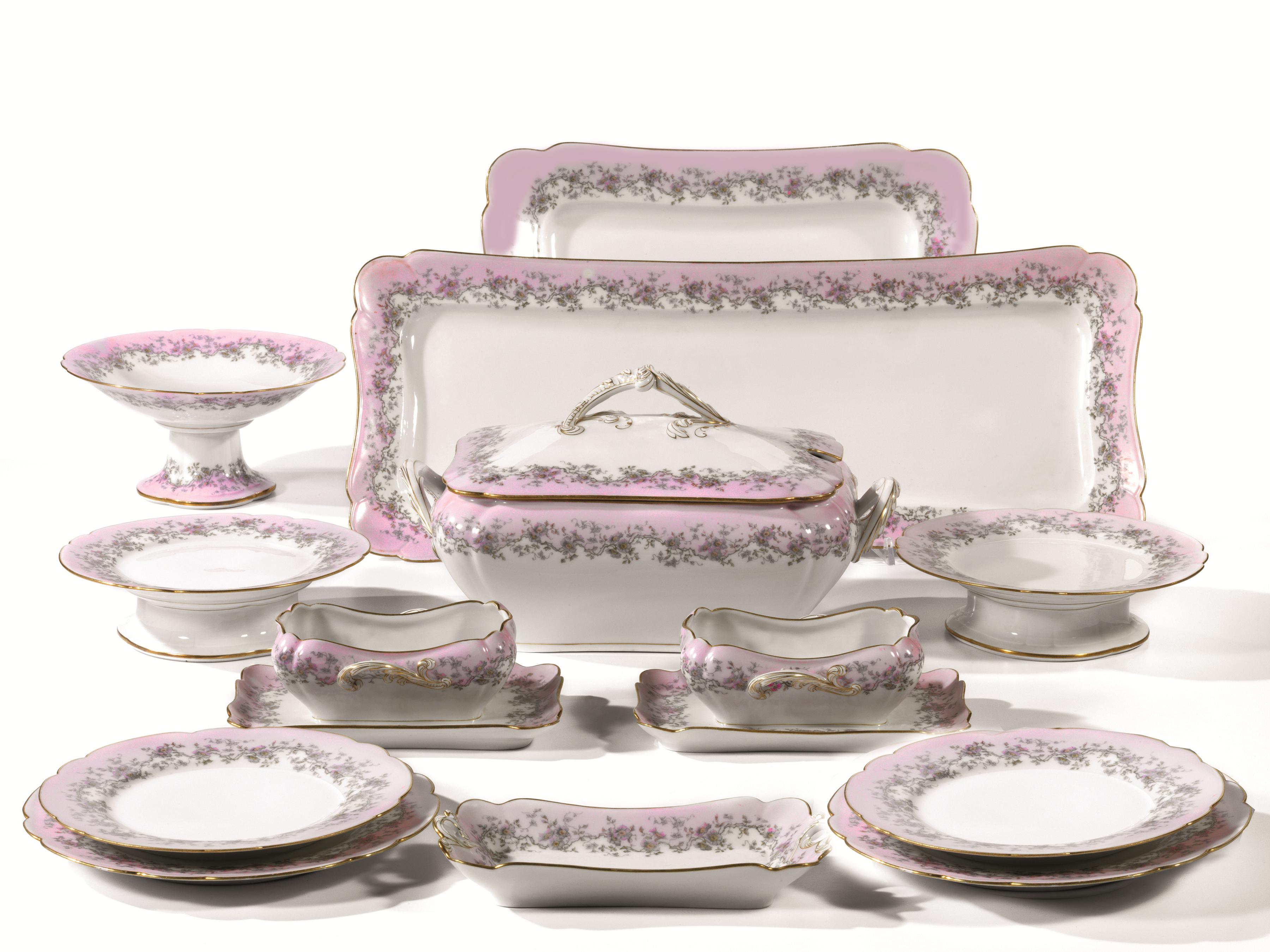 Servito di piatti, Francia, sec. XX, in porcellana bianca con tese decorate in rosa con tralci floreali, composto di centonovantadue pezzi, tre piatti fondi, otto piatti piani ed otto piatti da frutta sbocconcellati (192)