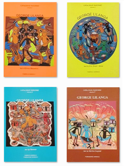 GEORGE LILANGA “Catalogue raisonne” Blocco dei quattro volumi del Catalogo Ragionato volume I, II, III, IV. Testo di Enrico Mascelloni, Parise editore, composto rispettivamente da 175,175, 214 e 84 pagine.