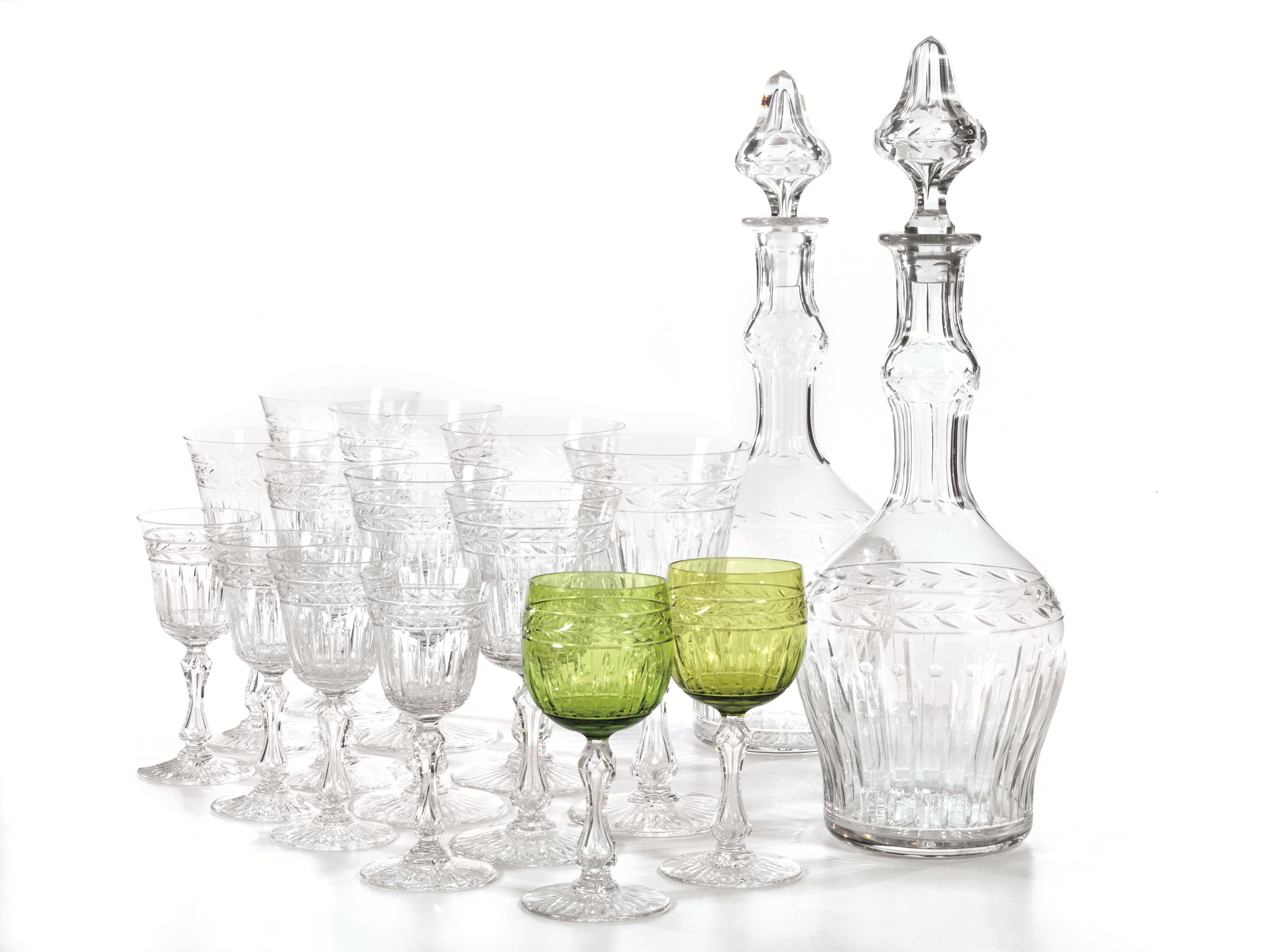 Servito di bicchieri, sec. XX, in cristallo molato composto di sessantacinque pezzi, un bicchiere da vino dolce con lievissima sbocconcellatura (65)