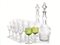 Composizione: 15 bicchieri da acqua di cui due di misura lievemente diversa, 18 bicchieri da vino, 9 coppette, 12 bicchierini da vino dolce, 9 bicchierini con calice verde, 2 bottiglie con tappo