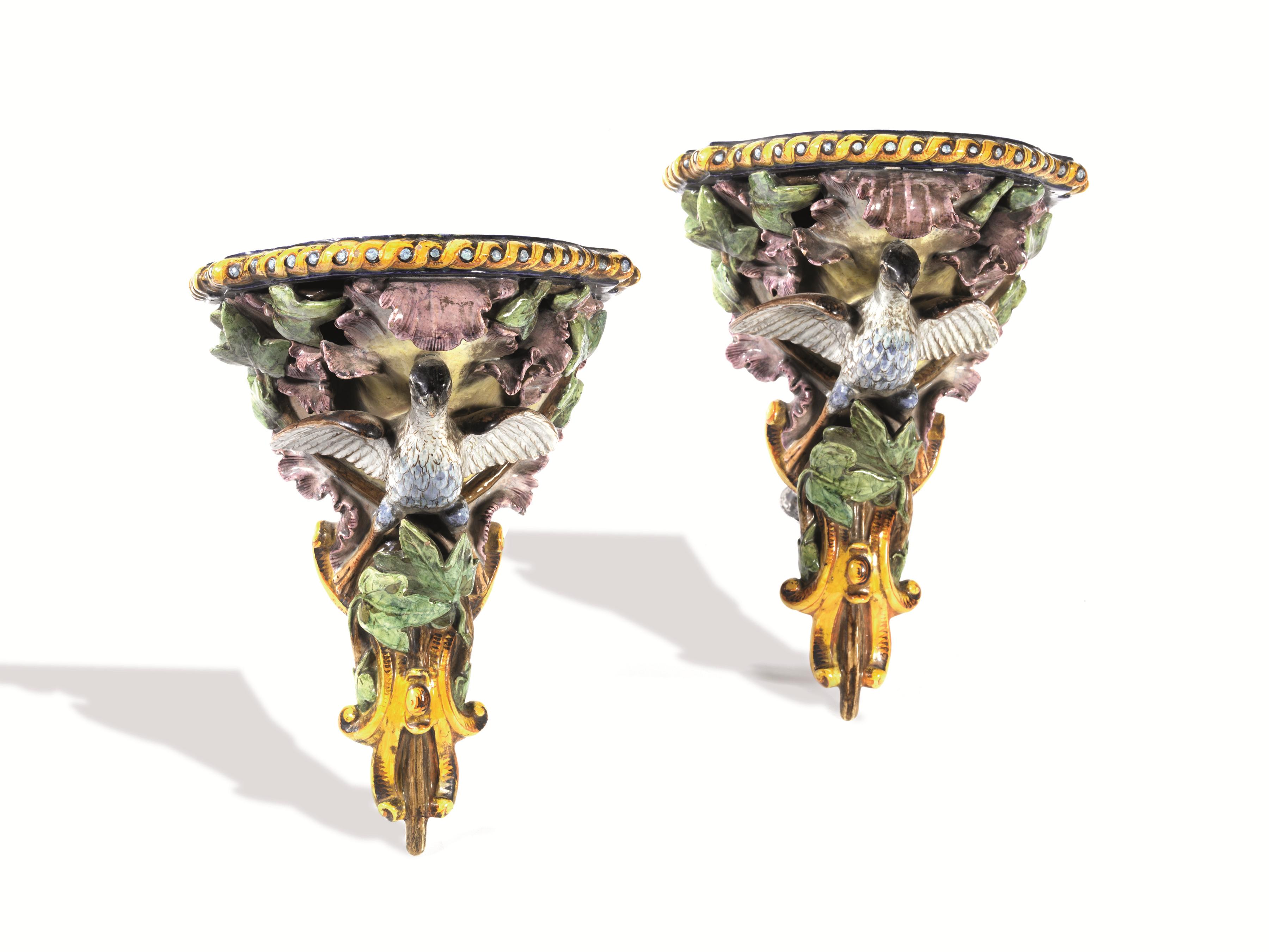 Coppia di mensole, manifattura Ginori, fine sec. XIX, in maiolica decorata a...
