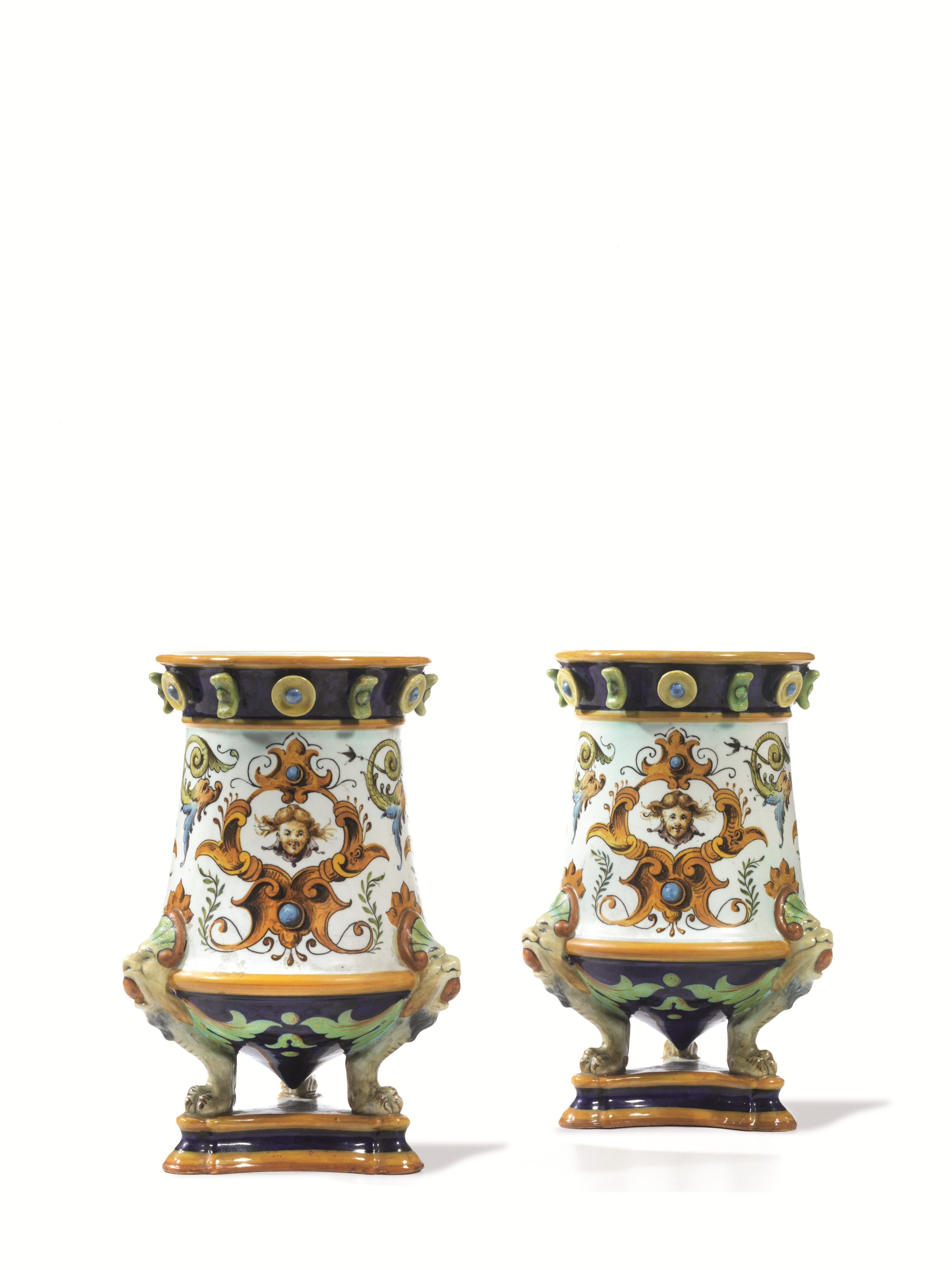 Coppia di mensole, manifattura Ginori, fine sec. XIX, in maiolica decorata a volatili tra elementi fogliacei, alt. cm 32 ed una coppia di vasi, manifattura Ginori, fine sec. XIX, in maiolica fondo avorio decorata a grottesche, bordo decorato da elementi a rilievo, poggianti su tre piedini uniti al corpo da mascheroni e terminanti a zampa ferina, base triangolare, alt. cm 24 (4)