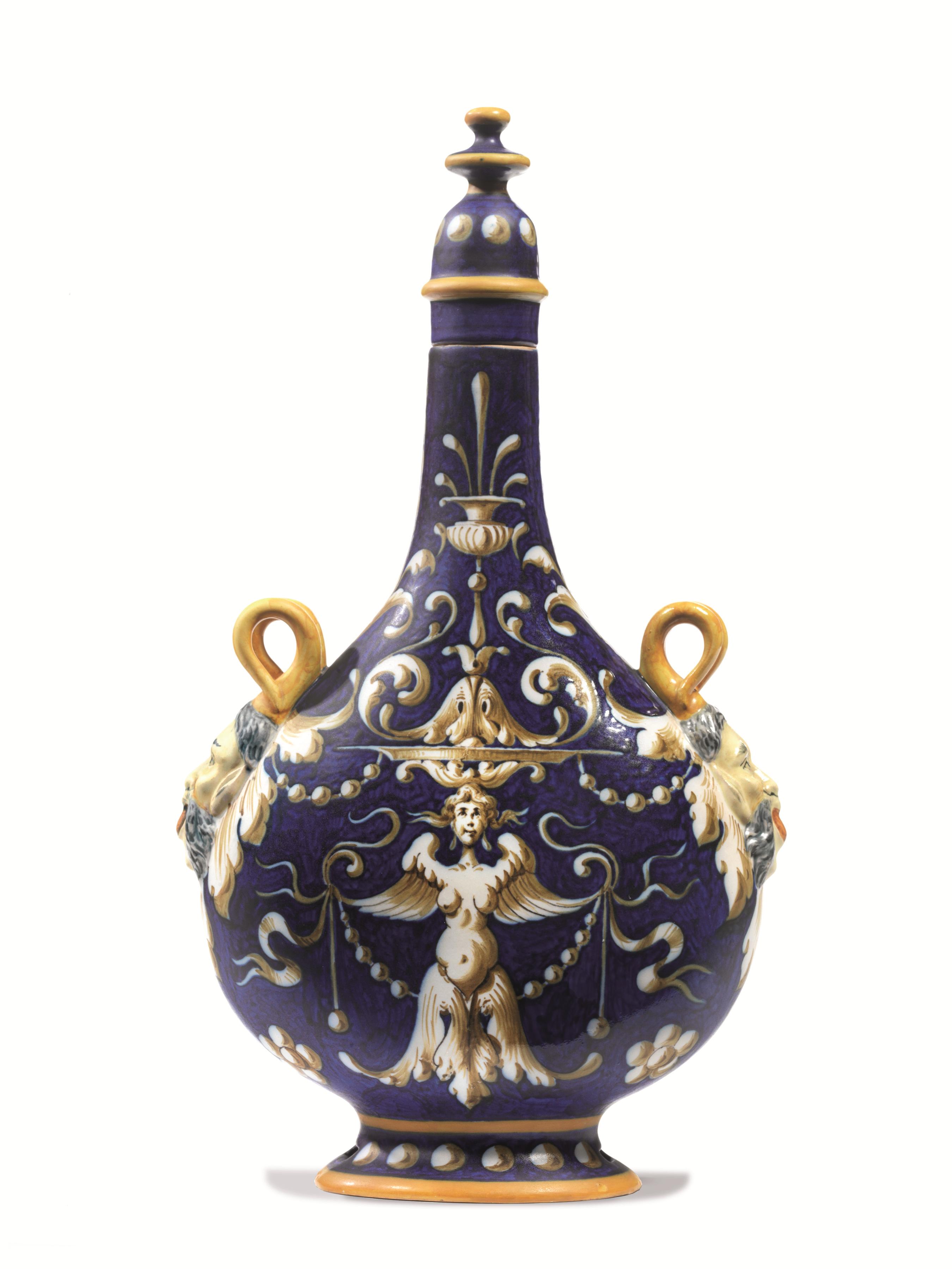 Fiasca, manifattura Ginori, fine sec. XIX, in maiolica blu decorata a grottesche, due anse unite al corpo da mascheroni, alt. cm 33